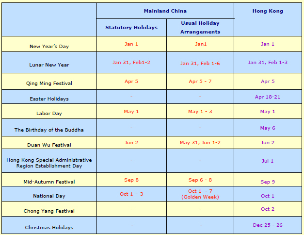 Festivals and Public Holidays for 2014 in Mainland China and Hong Kong