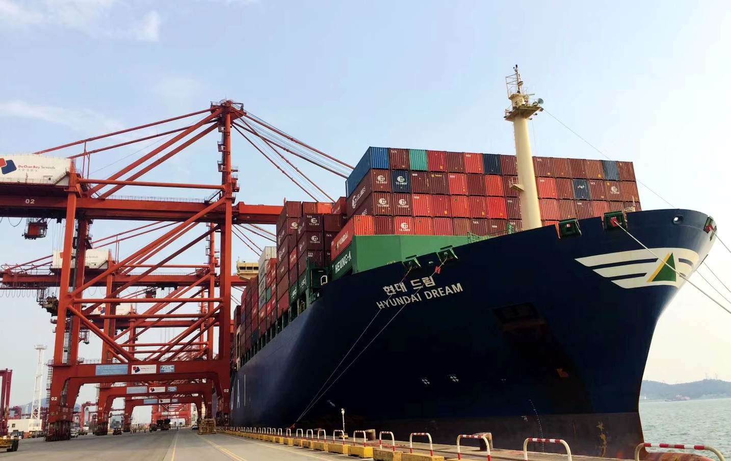 HMM deploys vessels of a capacity of 13,000 TEU on the KME service which calls DaChan Bay Terminals every Thursday with a port rotation of DaChan Bay - Gwangyang - Busan - Shanghai - Ningbo - Kaohsiung - Shekou - Singapore - Port Kelang - Jebel Ali - Dammam - Hamad - Sohar - Port Kelang - Singapore - DaChan Bay.
