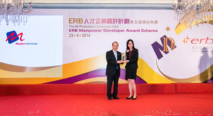 Modern Terminals has passed the assessment of the "Employee Retraining Board (ERB) Manpower Developer Award Scheme" and has been awarded "Manpower Developer (MD)" for two years from April 2014 to March 2016. The award this year recognized 46 organizations in Hong Kong. Up to now, a total of 289 organizations including many large well-known organizations and SMEs in Hong Kong have been accredited as Manpower Developers (MDs).