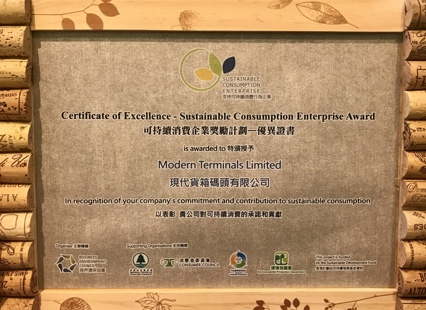 Modern Terminals has been awarded the “Sustainable Consumption Enterprise Award - Certificate of Excellence” by the Business Environment Council (BEC) to recognize our outstanding performance in green procurement.